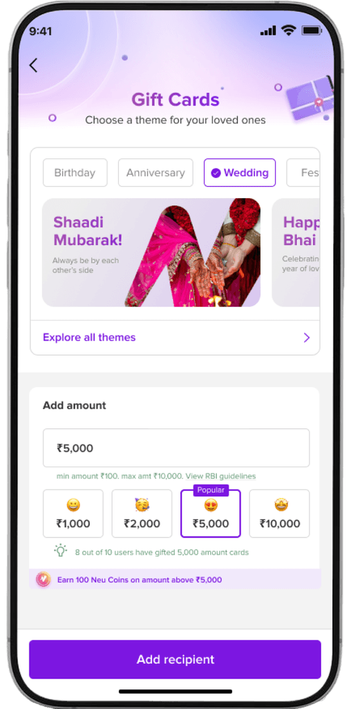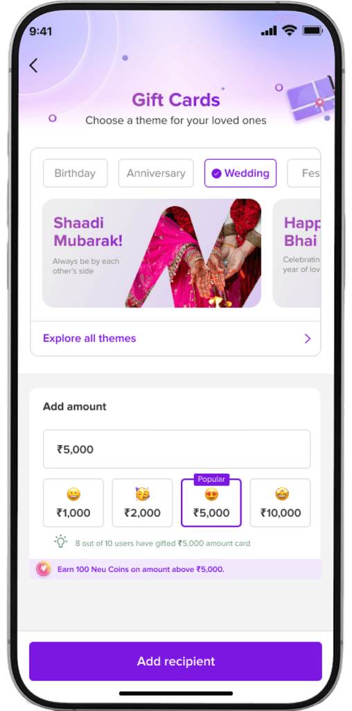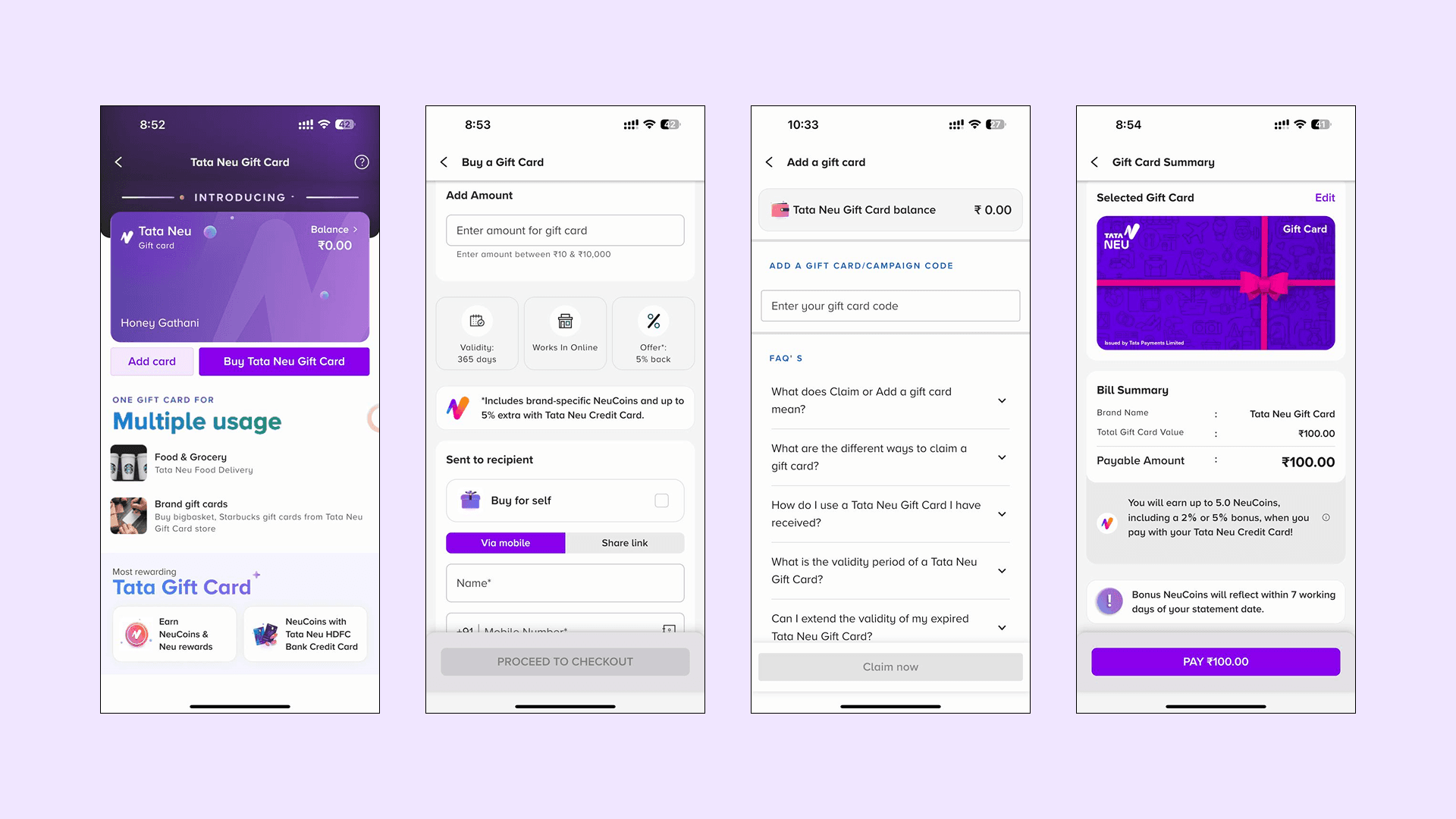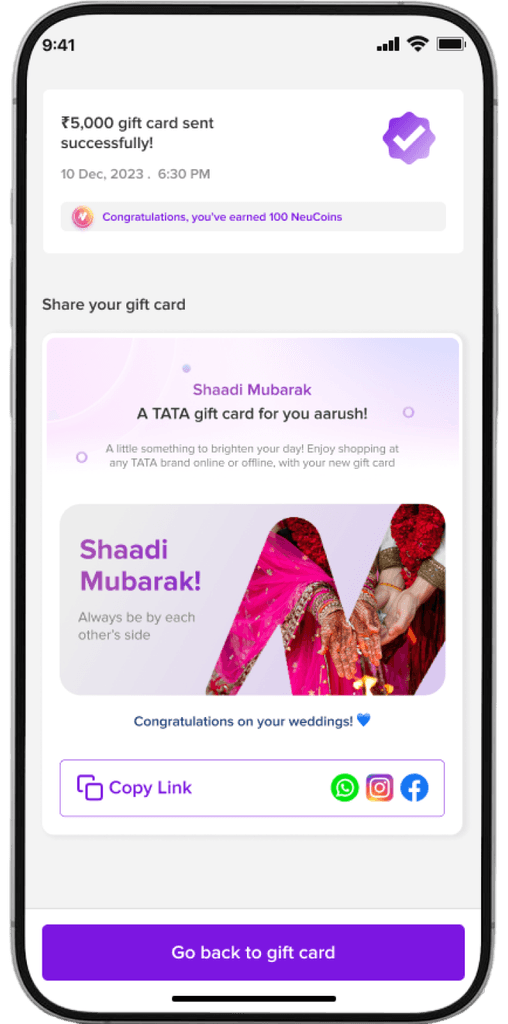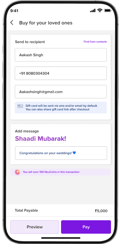 Users can instantly apply NeuCoins, see the net effective price upfront, and complete payment in fewer steps with the option to share the gift card digitally