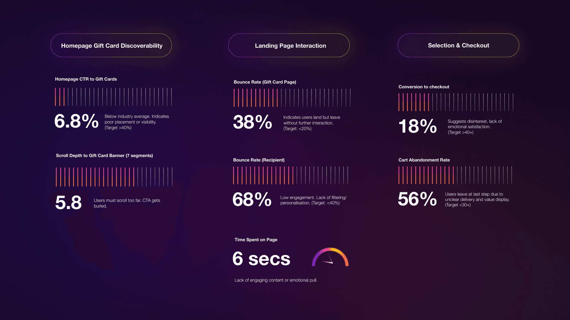 Drop-off Rate at key journey points - 19% category selection (before 38%) | 21% - recipient/personalization stage (before 68%)