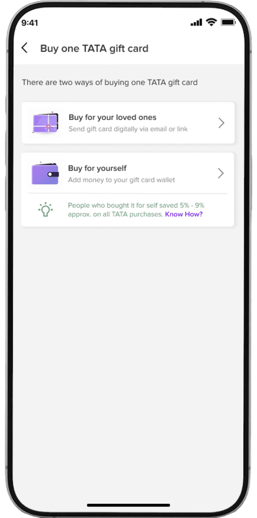 Occasion-based sorting, visual tiles, and search make it easy for users to find the perfect gift card quickly, reducing confusion and drop-offs.