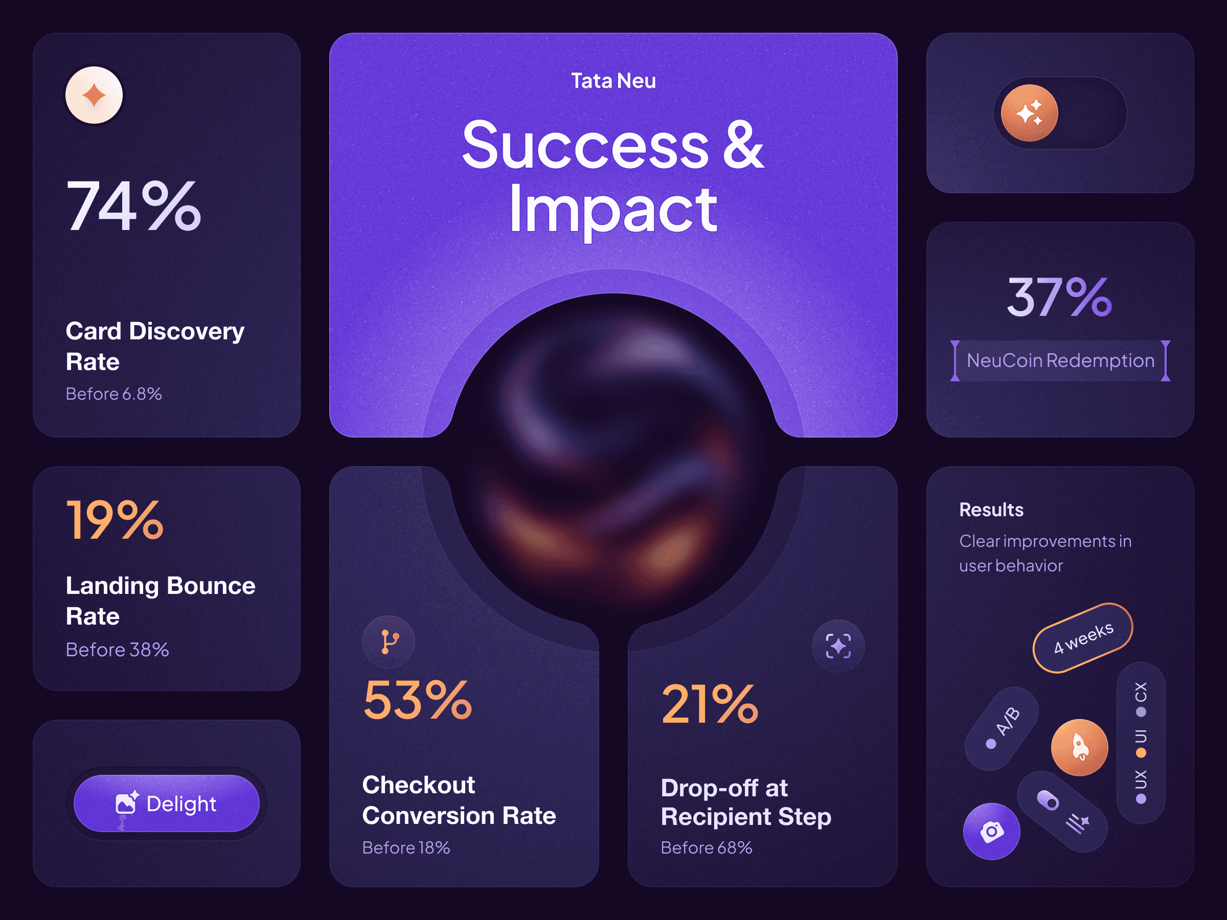 Despite being a powerful tool for driving cross-brand engagement, Tata Neu’s Gift Card section was underperforming <2% to digital product revenue. The business faced low discoverability, high checkout drop-offs, and underutilization of NeuCoins, which directly impacted conversion rates, average order value (AOV), and user loyalty. User retention and engagement were reportedly lackluster, with monthly active users falling below 10 million