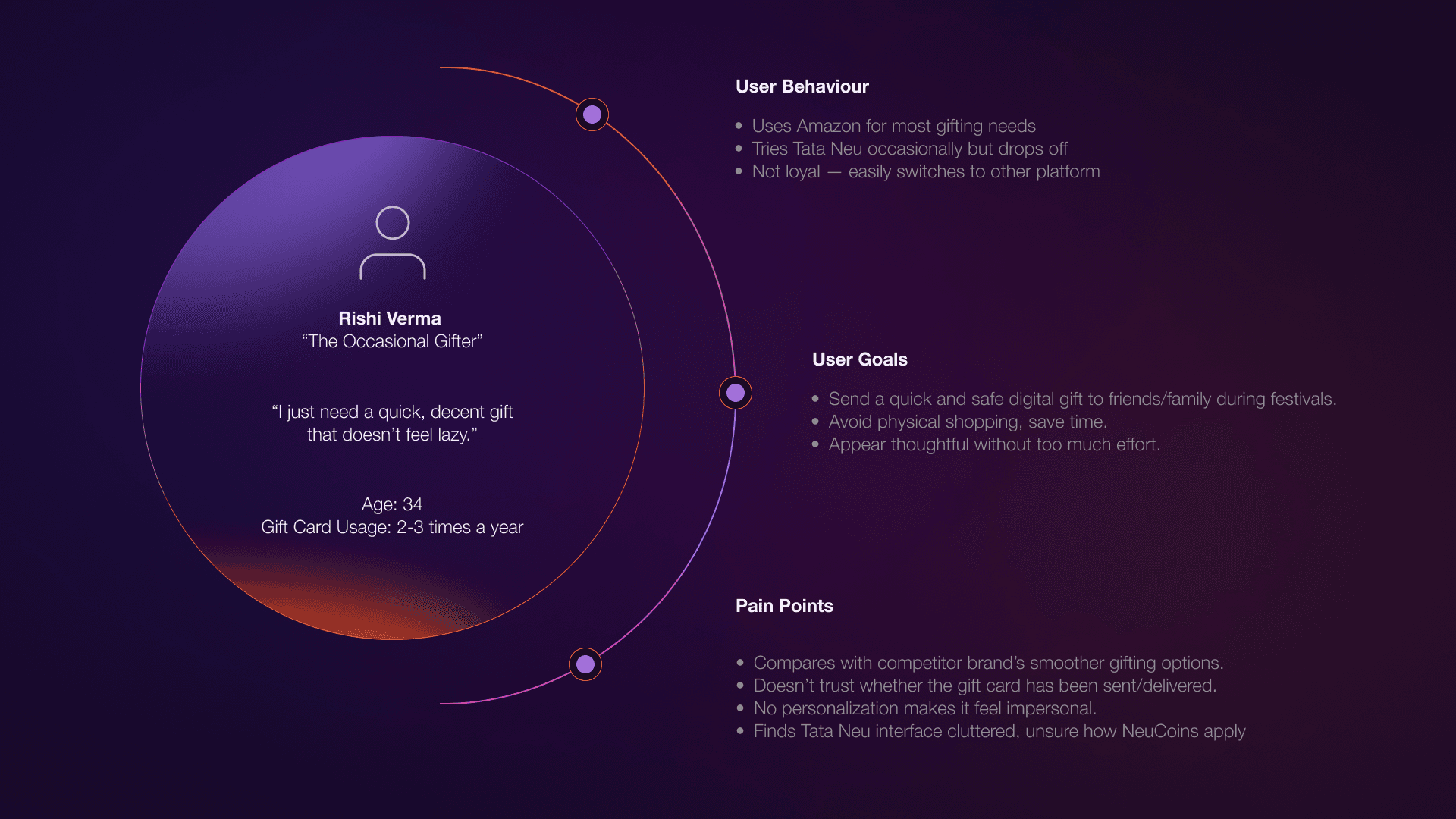 Based on the personas & usability, we concluded that Tata Neu users ranging from occasional gifters to loyal Tata customers needed a gifting experience that was both intuitive and rewarding. They were looking for a flow that made it easy to discover the right gift, personalize it, and check out seamlessly, while also feeling assured of its value through clear redemption options and NeuCoin integration.